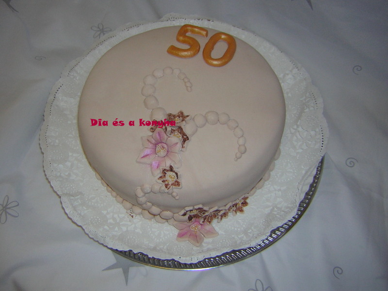 Visszatérve a tortákra, az első egy tiramisu ízű 50. házassági évfordulóra készült torta volt. Mivel teljesen rám bízták a kinézetét, kipróbálhattam valami újat. Régóta nézegetem Gabi a tortatanonc barnás színvilágú elegáns tortáit, mindenképpen ki szerettem volna próbálni egyszer. Most jött el az alkalom. Picit minimalistább a díszítés, de nekem is és az ünnepelteknek is nagyon tetszett, és örültek neki, hogy szabad kezet adtak. Mellékesen megjegyzem, hogy az új, szülinapomra kapott, marcipánmintázó készlettel kezdem megtanulni a virágkészítést is. :))) Ja és a gyöngysort a gyerekek gyurmakészletéből kölcsönvett és alaposan kimosott formával csináltam.